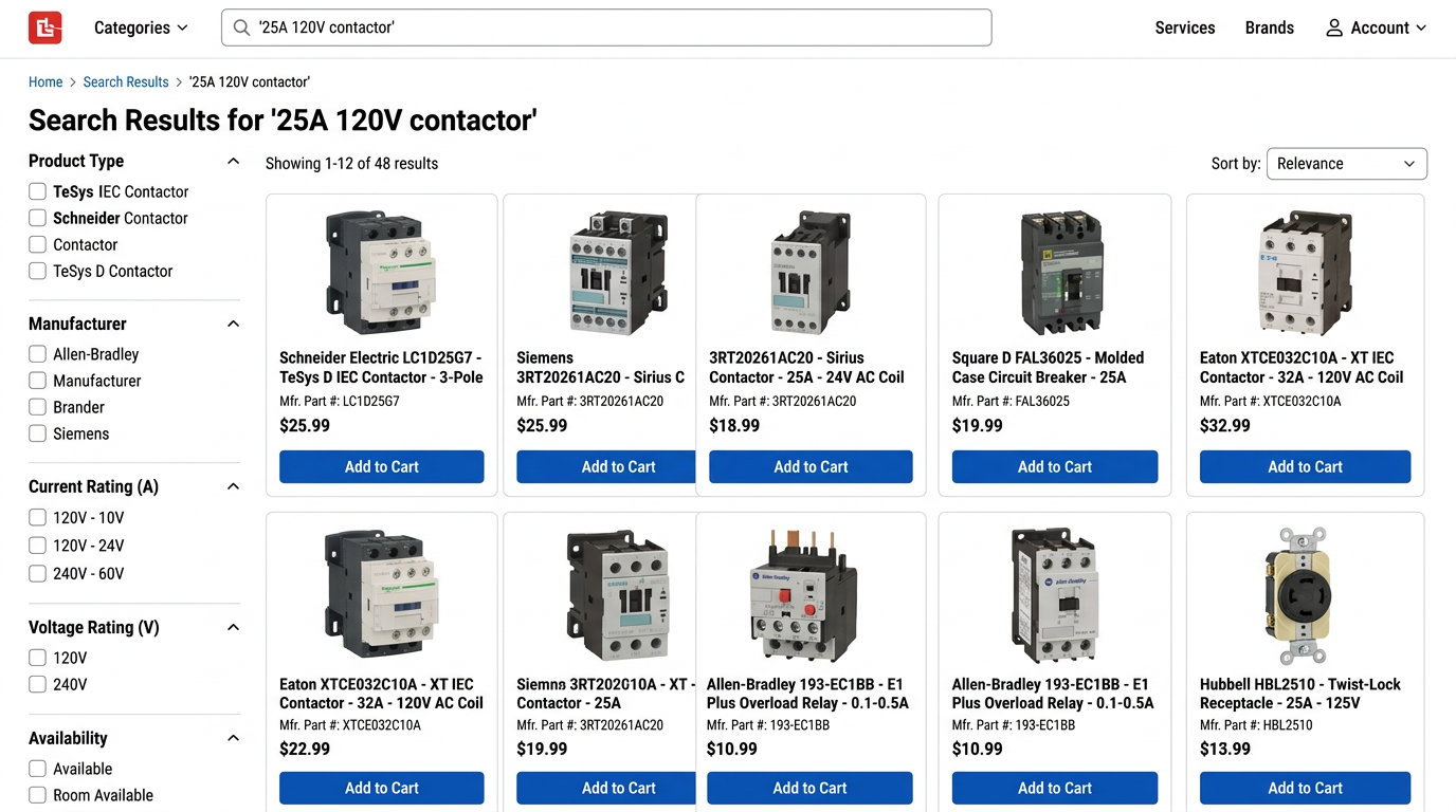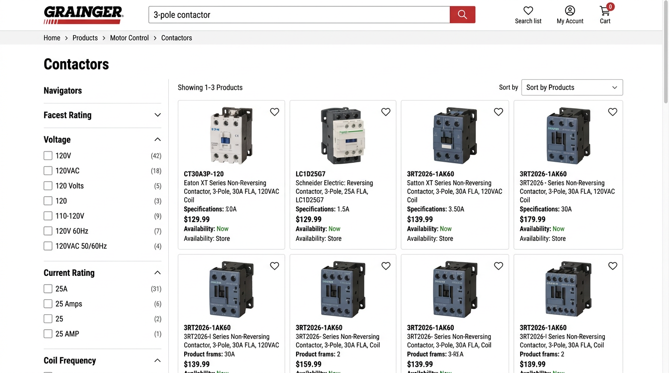 Search relevance depends on structured attributes, not longer descriptions. When someone searches "25 amp 3 pole contactor 120v" your product needs to match on each token independently.