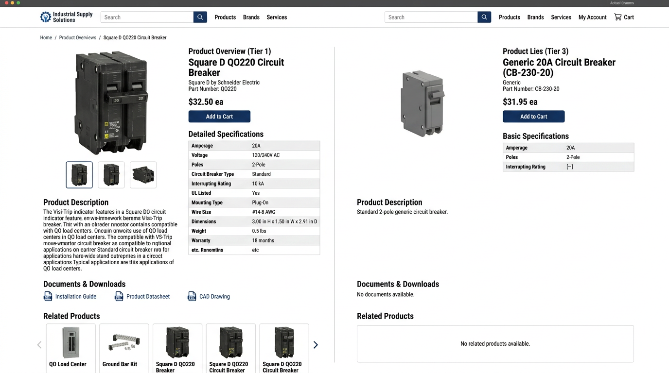 For Tier 2, cut to the essentials: image, 2-sentence description, and 3 key specs only. For Tier 3, baseline is manufacturer name, part number, and price. Enrich when traffic justifies it.