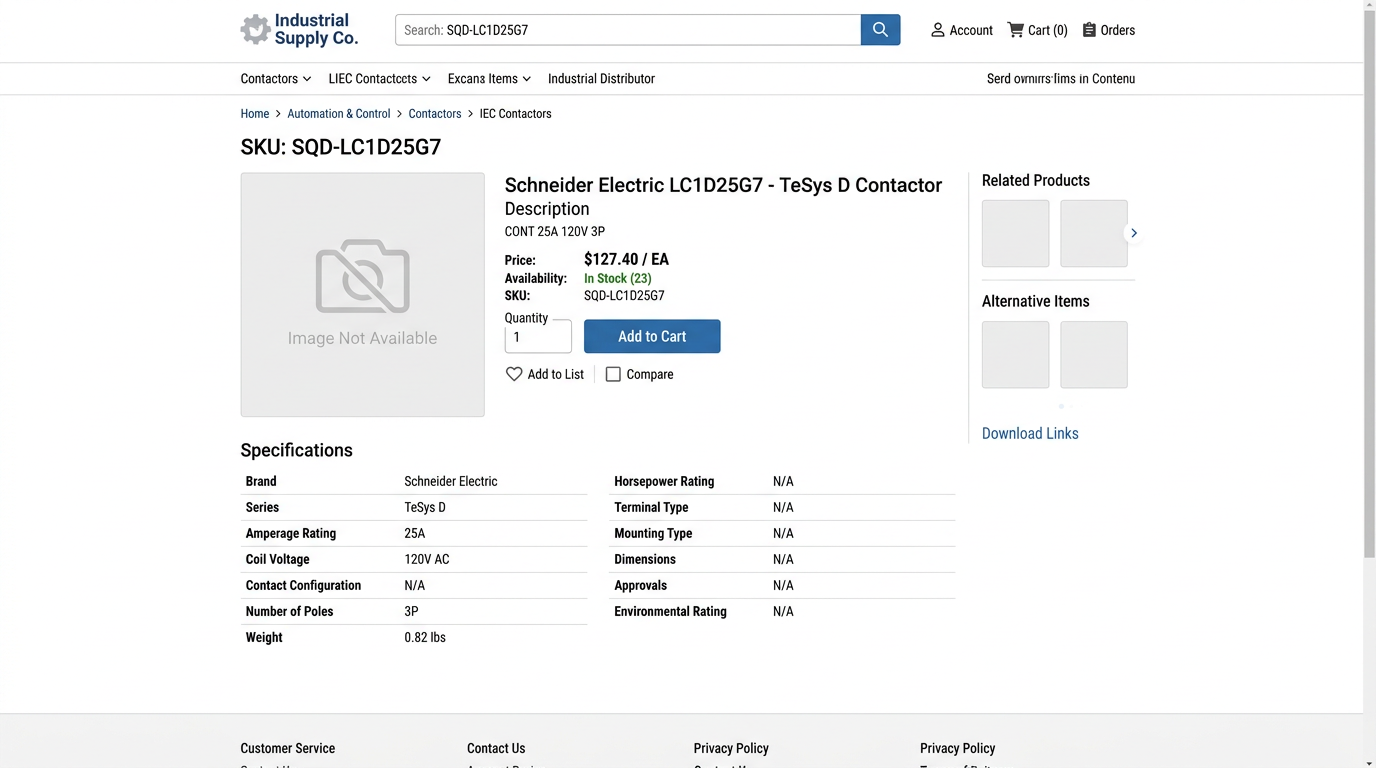 The same contactor on a working product page needs 28+ populated fields. Export your product data and compare what you're sending versus what displays on the page. The majority of your SKUs show incomplete listings: truncated descriptions, missing specs, no images, broken filters.