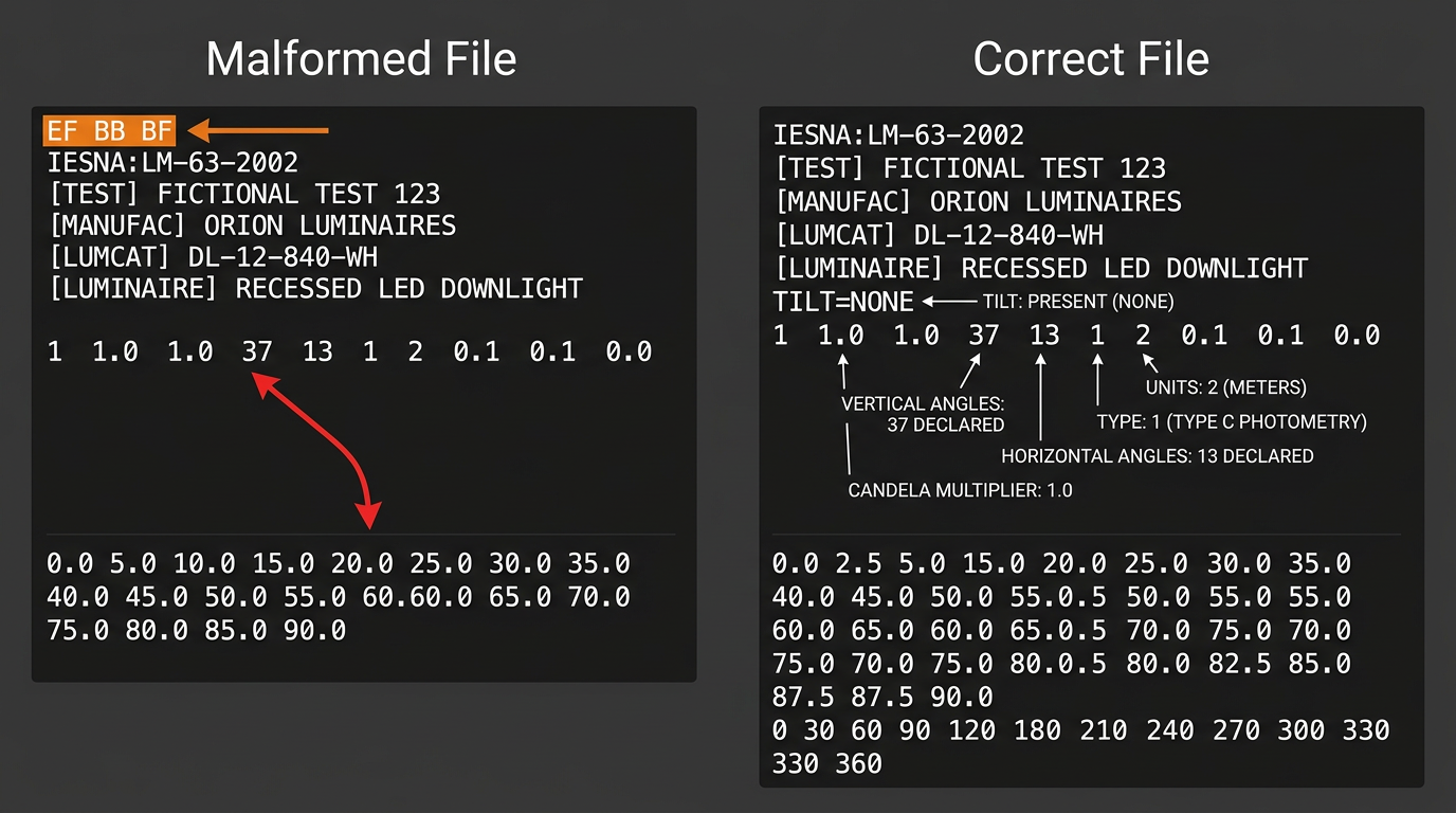 IES files are plain ASCII text. Every field on the 10-value photometric parameter line has a fixed position and specific legal values. Most import failures come from five predictable errors: angle count mismatch, missing TILT line, wrong photometric type, truncated candela data, and encoding issues. All visible in a text editor in under a minute.